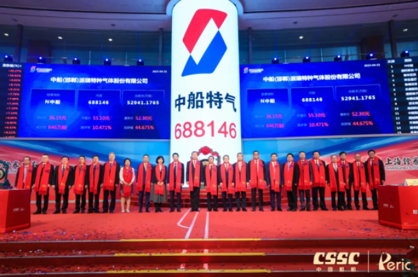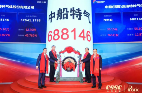 4月21日,中國船舶集團有限公司旗下中船(邯鄲)派瑞特種氣體股份有限公司(簡稱:中船特氣,證券代碼:688146)首次公開發(fā)行A股上市儀式在上海證券交易所舉行。這是中國船舶集團旗下第12家上市公司,也是集團公司重組后首家在科創(chuàng)板公開發(fā)行A股的上市公司。中國船舶集團黨組書記、董事長溫剛出席儀式,黨組成員、總會計師賈海英出席儀式并致辭,黨組成員、副總經(jīng)理盛紀綱出席儀式。