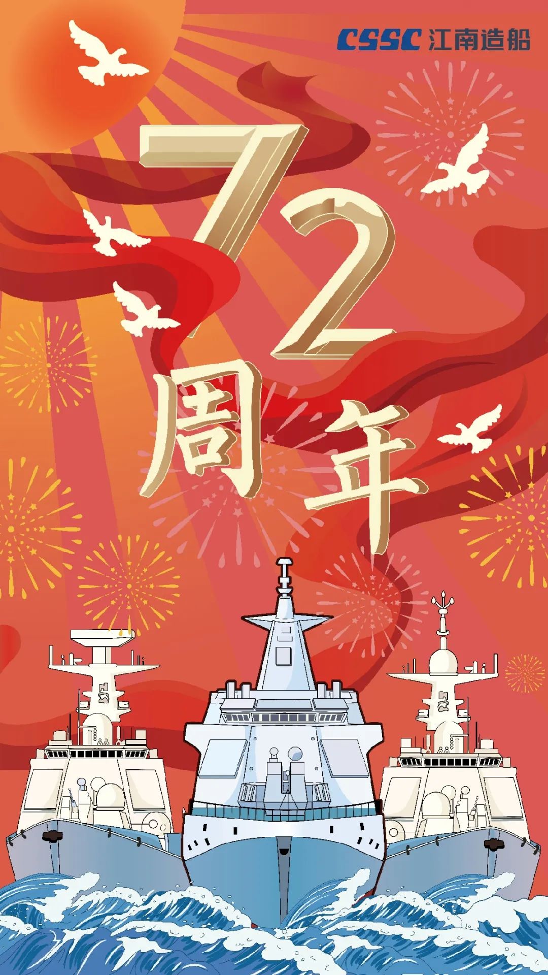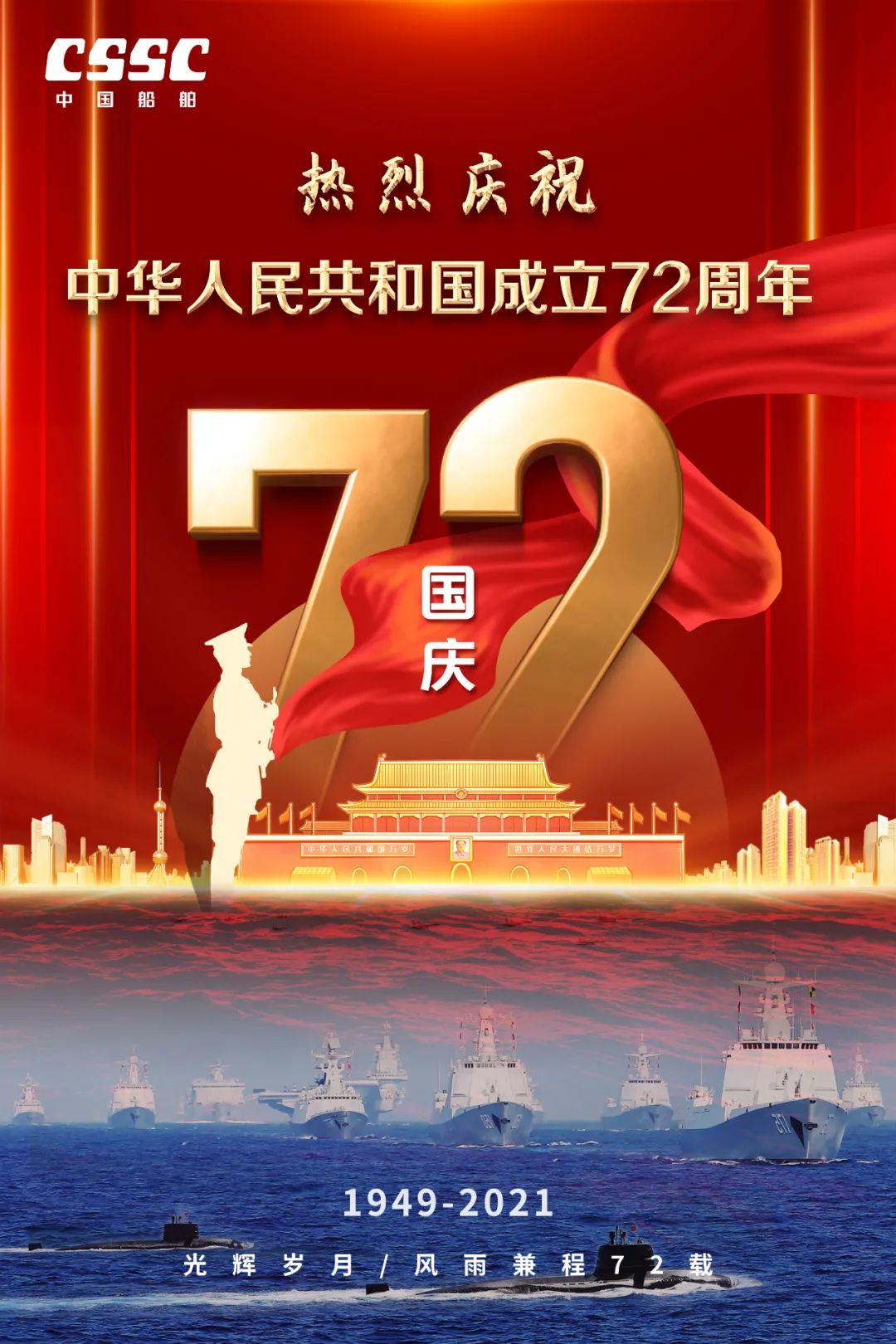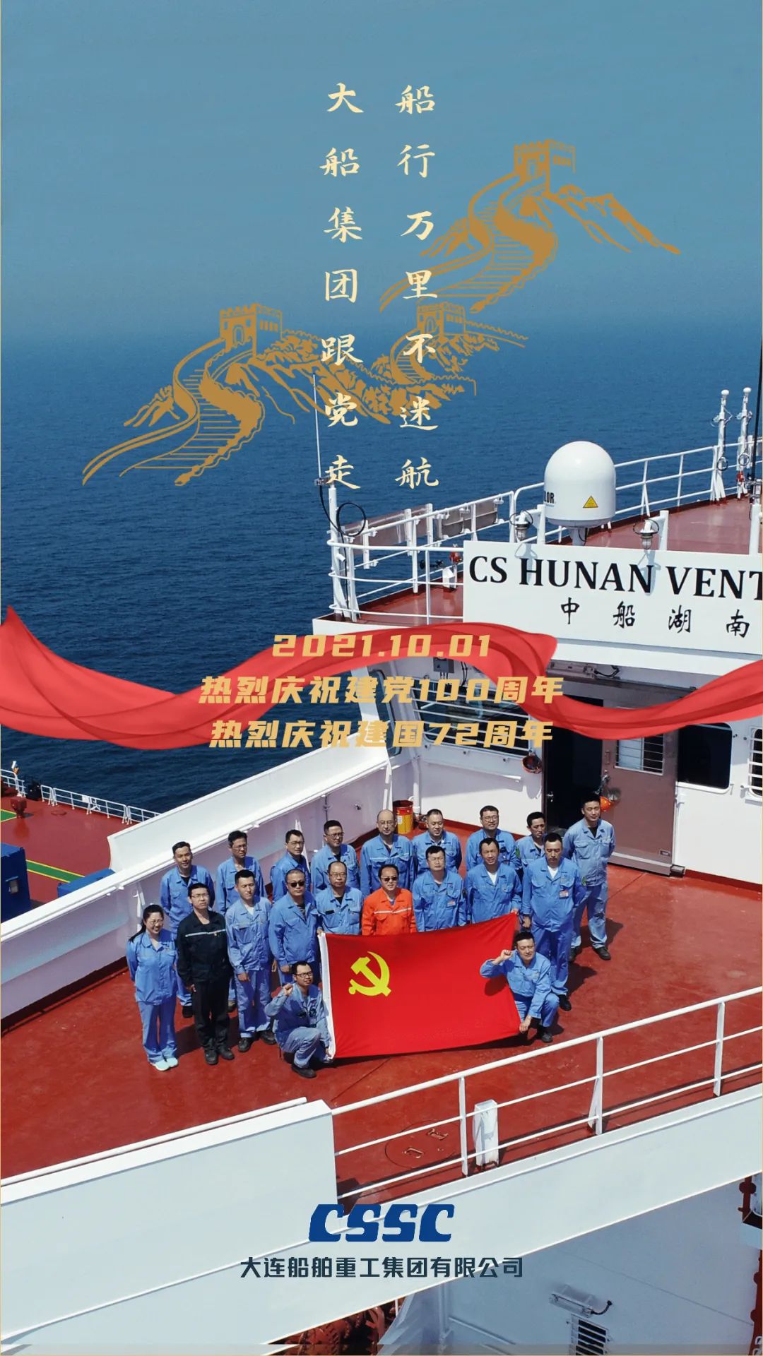 今天,我們迎來新中國72周年華誕。作為我國海軍裝備建設(shè)的主力軍,中國船舶大船集團將不忘初心,牢記使命,堅定貫徹海洋強國、制造強國、科技強國國家戰(zhàn)略,聚焦主責主業(yè)、聚力興裝強軍,為實現(xiàn)中華民族偉大復興的中國夢而不懈奮斗。