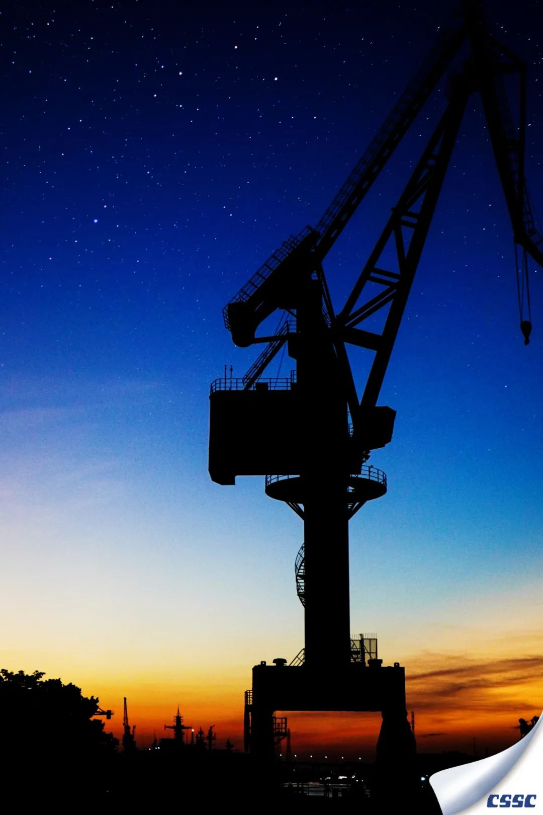 雖與巨輪不同,但船舶生產場地的起重器械亦可稱大國重器。此圖拍攝于2022年2月11日黃埔文沖,恰逢黃昏與星夜交替,器械與船舶共舞。舉起相機對著夕陽,記錄下這美好的時刻,以剪影的形式表現工作中的船舶風景。