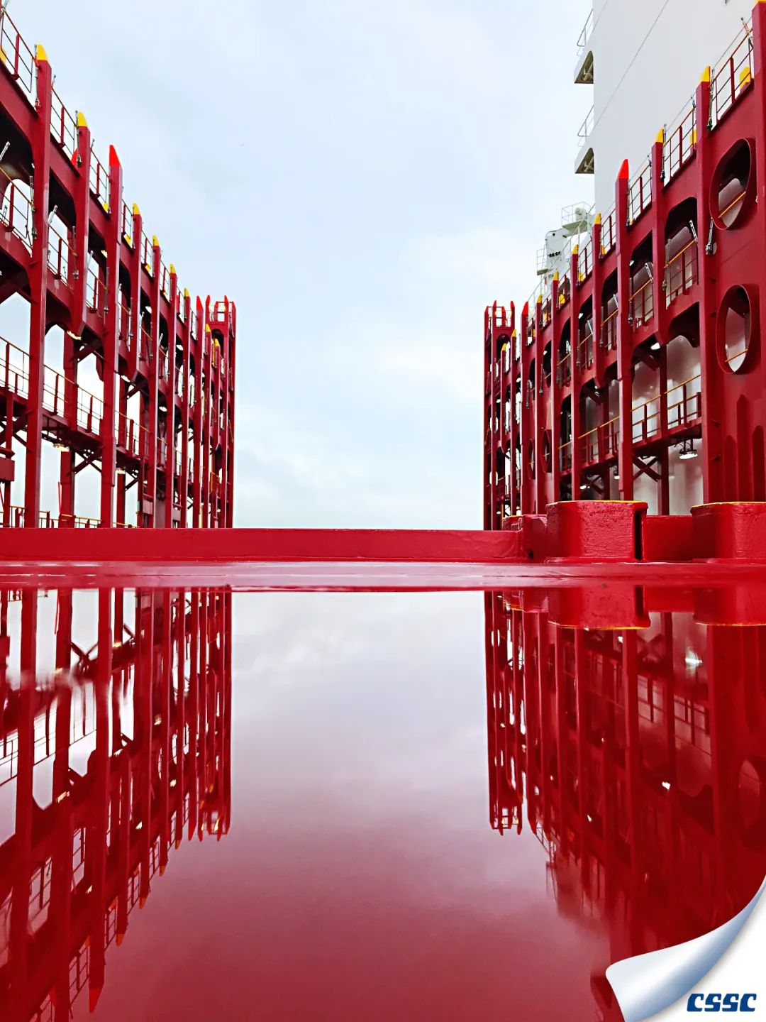 由七〇八所研發設計的20000TEU超大型集裝箱船試航期間,紅色的船體與倒影融為一體,充滿了夢幻色彩,寓意紅色基因在實現海洋強國夢的征程中愈發光彩奪目。