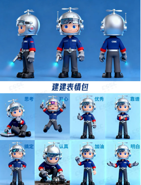 建建(造船擔當)以銀色防護頭盔(嵌船舶零件電子屏、印艦船剪影)、船錨腰帶、CSSC工裝及焊槍,凸顯造船匠心精神;航航(航行擔當)憑船舵頭飾、導(dǎo)航羅盤、海鷗披風(fēng)與船錨上衣,傳遞中船航行使命。二者以 “建造 - 航行” 閉環(huán),具象中船全鏈條實力,彰顯中船文化。