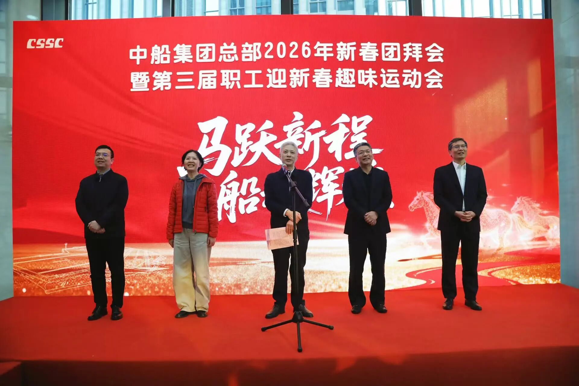 金蛇辭歲,駿馬迎春。在農(nóng)歷馬年新春佳節(jié)來臨之際,2月11日,中國船舶集團(tuán)有限公司總部舉行2026年新春團(tuán)拜會暨第三屆職工迎新春趣味運(yùn)動會。中船集團(tuán)黨組書記、董事長徐鵬代表中船集團(tuán)黨組向辛勤耕耘、篤行實(shí)干的集團(tuán)全體干部職工,向始終相伴、傾情付出的全集團(tuán)家屬們,致以最衷心的感謝和最誠摯的問候。黨組副書記、董事、集團(tuán)工會主席賈海英,黨組成員、總會計師朱永紅,黨組成員、副總經(jīng)理彭原璞、胡賢甫出席團(tuán)拜會。