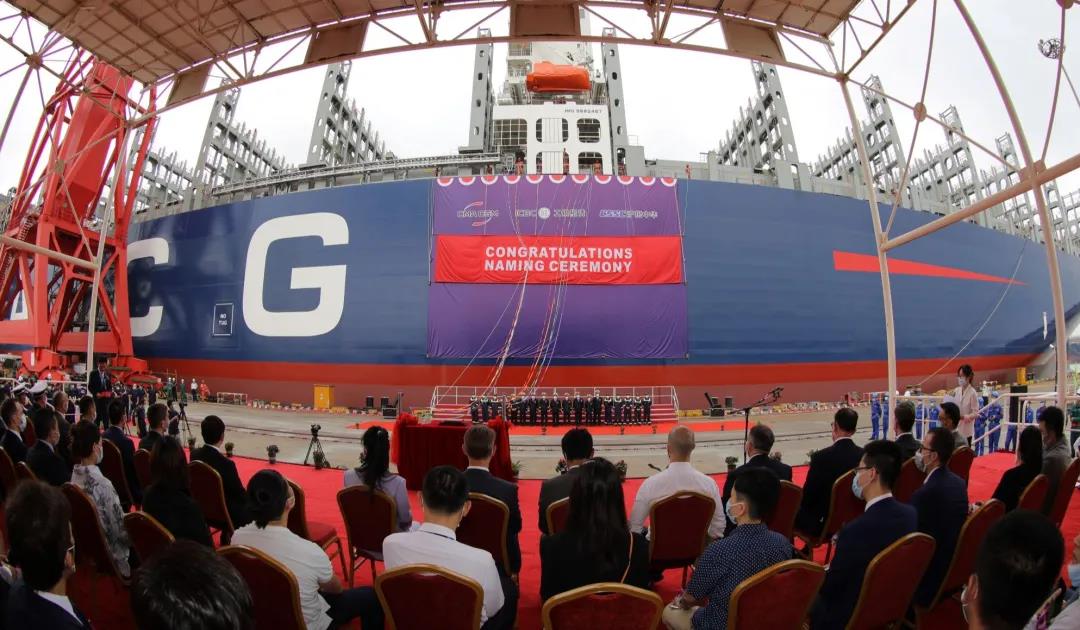 8月27日,由中國船舶集團(tuán)有限公司旗下滬東中華聯(lián)合中船貿(mào)易為法國達(dá)飛海運(yùn)集團(tuán)建造的15000TEU超大型集裝箱系列船首制船“達(dá)飛·和風(fēng)”號命名交付。這是中法兩國船海巨頭全面落實(shí)2019年中國國家主席習(xí)近平和法國總統(tǒng)馬克龍見證簽署的戰(zhàn)略合作框架協(xié)議的最新成果。同時(shí),也標(biāo)志著“CSSC超大型箱船譜系”又添“新丁”,實(shí)現(xiàn)了對全球超大型集裝箱船發(fā)展的引領(lǐng)。