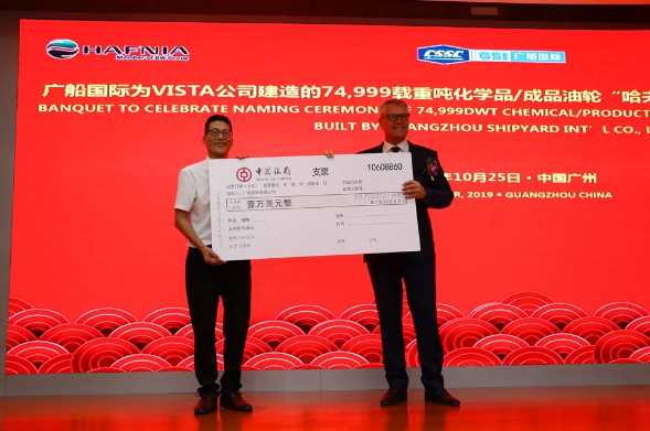 10月25日,廣船國際有限公司為VISTA公司建造的7.5萬噸化學品/成品油船4號船命名交付。這是廣船國際在“決戰120天,掀起生產高潮”勞動競賽中收獲的又一枚勝利果實。該船比合同交船期提前43天交付,船東為此專門獎勵廣船國際1萬美元。