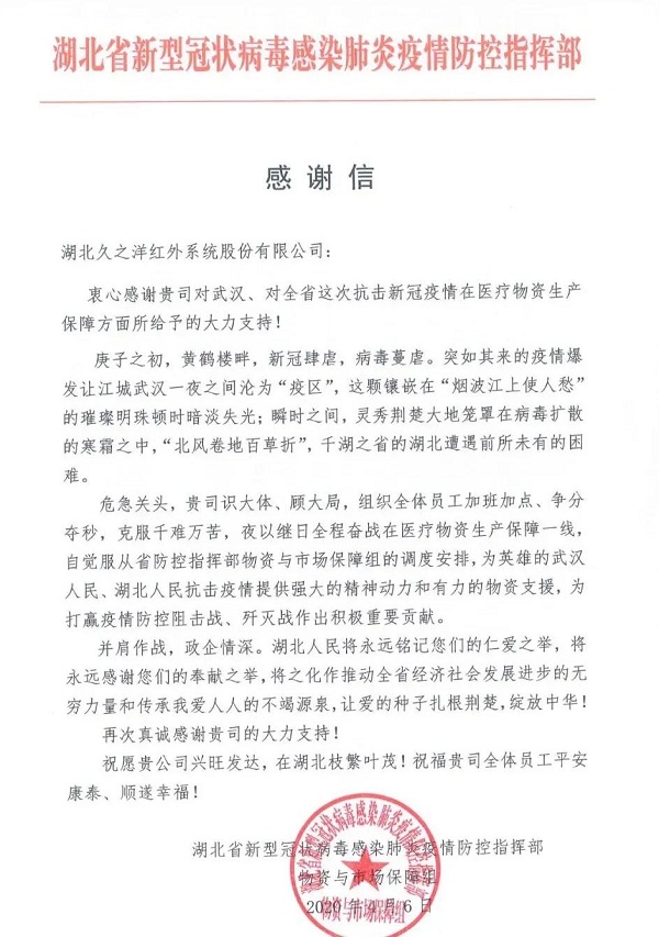 ????信中,對中國船舶集團七一七所所屬湖北久之洋紅外系統(tǒng)股份有限公司在抗擊新冠肺炎疫情工作中,在醫(yī)療物資生產(chǎn)保障方面給予的大力支持表示感謝。