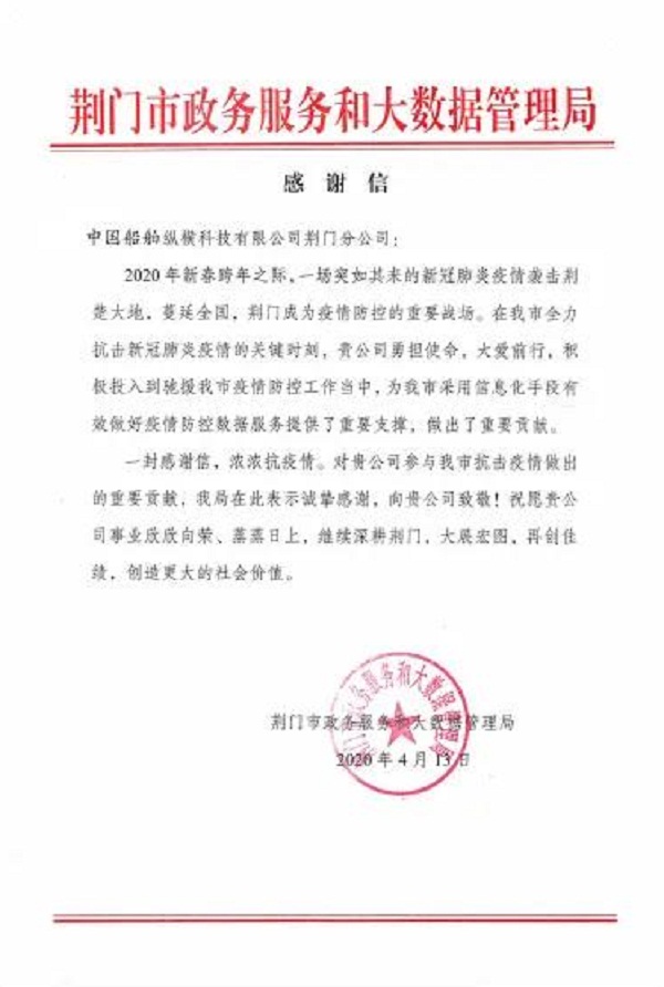 ????中國船舶集團七一〇所縱橫公司荊門分公司收到荊門市政務(wù)服務(wù)和大數(shù)據(jù)管理局寄來的感謝信,感謝其在抗擊新冠肺炎疫情的關(guān)鍵時刻,為荊門市采用信息化手段有效做好疫情防控數(shù)據(jù)服務(wù)提供了重要支撐,作出了重要貢獻。