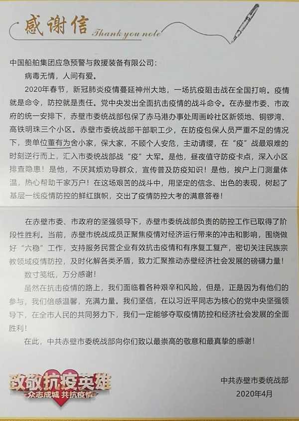 ????中共赤壁市委統(tǒng)戰(zhàn)部特向中國船舶集團旗下中國應(yīng)急發(fā)來感謝信,對中國應(yīng)急員工董有為舍小家保大家,不顧個人安危,主動請纓,在戰(zhàn)“疫”最艱難的時刻逆行而上表示感謝和致敬。
