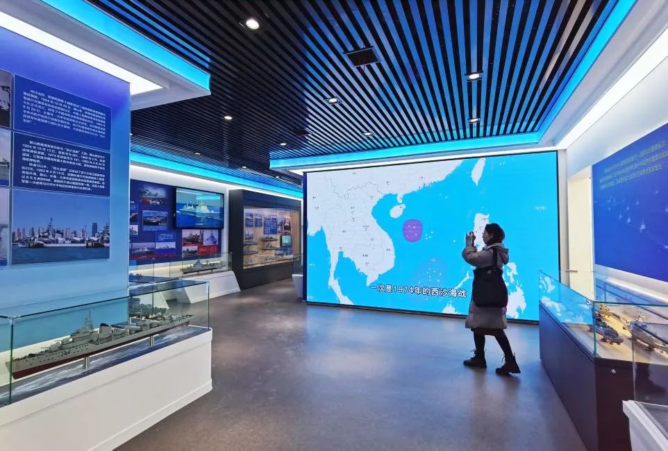 由中國船舶七一四所設計施工的艦船打卡地,有著10米長的大型長沙艦模型,重達8.75噸的船錨昂首挺立,45艘包括航母、核潛艇、驅逐艦、護衛艦在內的各型艦船武器模型,200多幅圖片文字,為觀眾展示了近代以來海軍裝備波瀾壯闊的發展歷程。