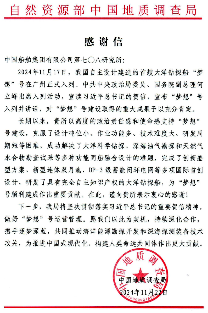 中國地質調查局在信中對中國船舶集團七〇八所在“夢想”號立項論證、研發設計、建造調試等階段所做的突出工作和卓越貢獻表示感謝。