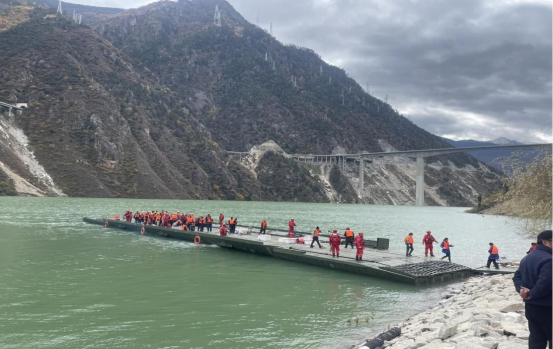 11月11日,四川省阿壩州馬爾康市雙江口水電站紅旗橋發生垮塌事故。險情發生后,中國船舶集團有限公司旗下中船應急研制的動力舟橋緊急投入搶險救援行動中。
