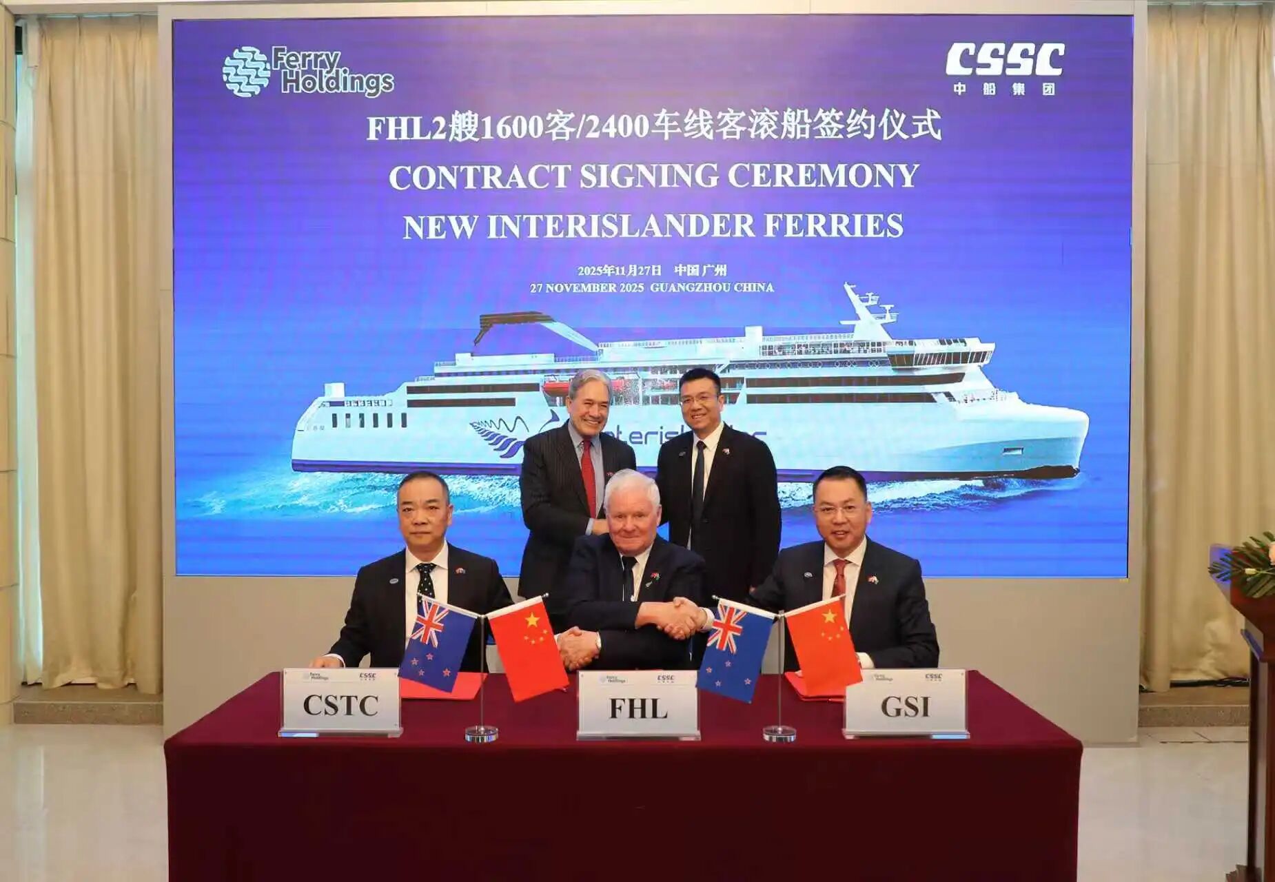 11月27日,中國船舶集團有限公司旗下廣船國際有限公司攜手新西蘭FHL(Ferry Holdings)公司簽署2艘新型客滾船建造合同。當天簽約的客滾船項目,是連接中新兩國友誼的重要紐帶。在中船集團與FHL公司攜手推動下,雙方共贏合作邁出了關鍵一步。