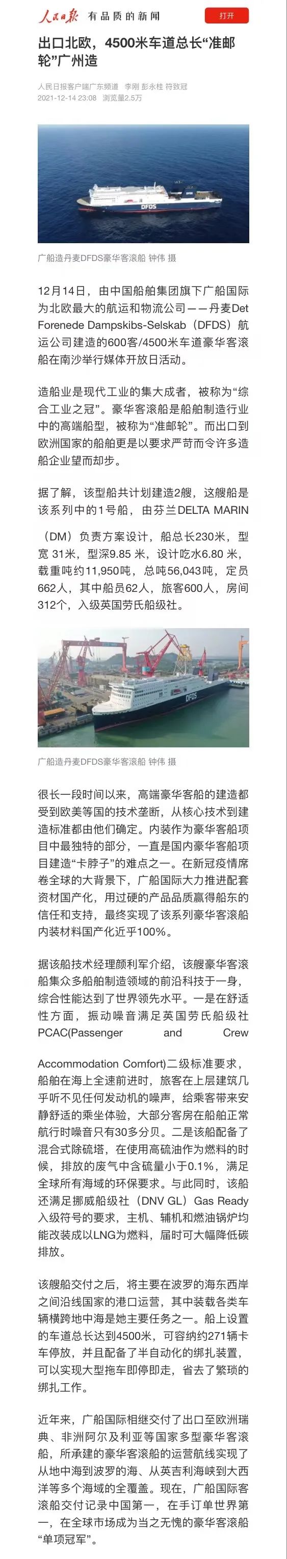對這艘“準(zhǔn)郵輪”的高端船舶,媒體盛贊廣船國際在新冠疫情席卷全球的大背景下,大力推進(jìn)配套資材國產(chǎn)化,用過硬的產(chǎn)品品質(zhì)贏得船東的信任和支持,最終實現(xiàn)了該系列豪華客滾船內(nèi)裝材料國產(chǎn)化近乎100%,是當(dāng)之無愧的豪華客滾船“單項冠軍”。