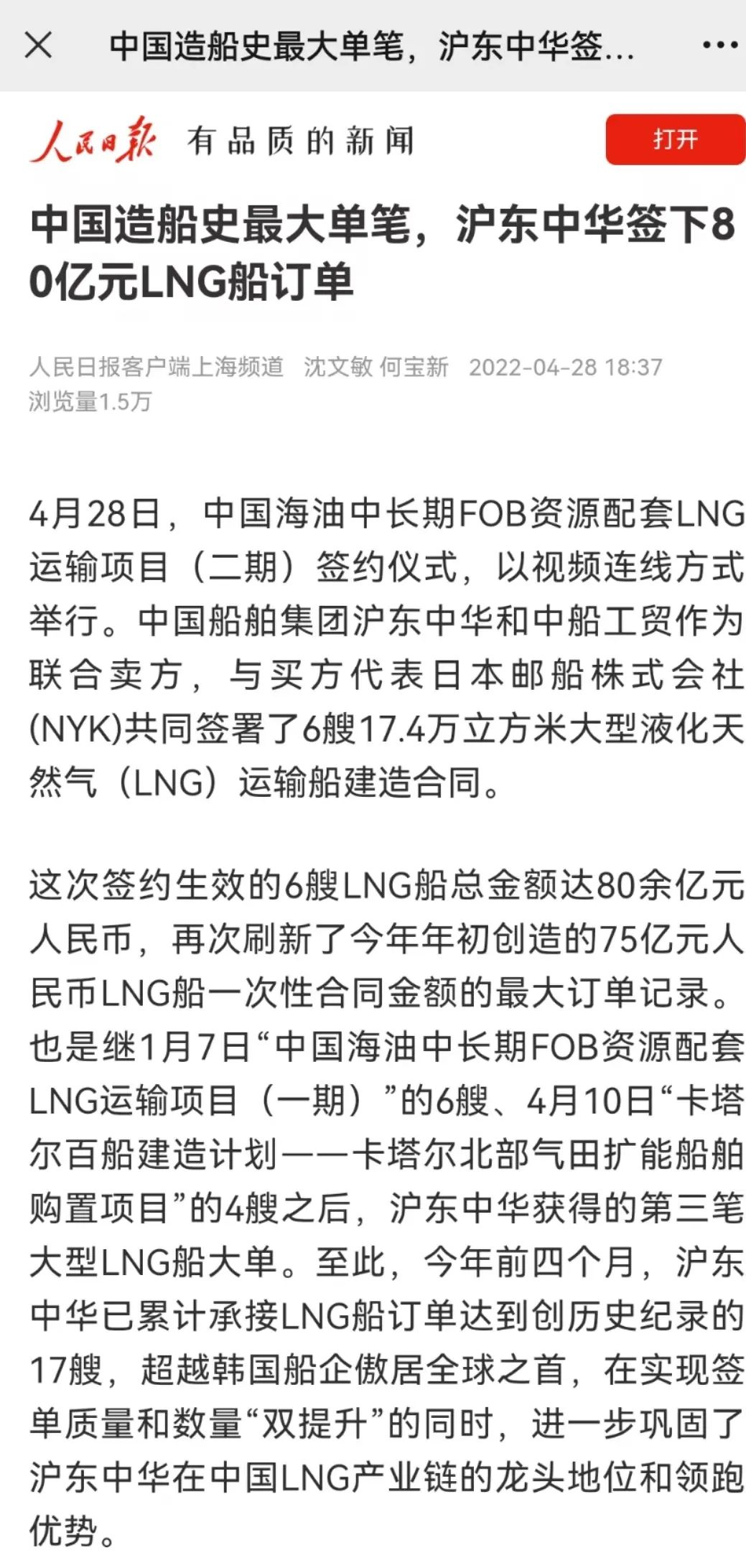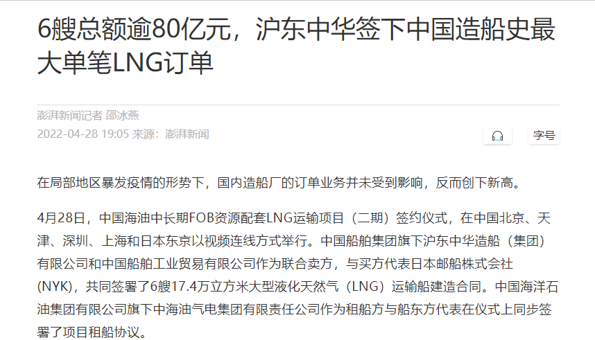 這次簽約生效的6艘LNG船總金額達(dá)80余億元人民幣,再次刷新了今年年初創(chuàng)造的LNG船一次性合同金額最大訂單紀(jì)錄。至此,今年前4個月滬東中華已累計(jì)承接LNG船訂單達(dá)到創(chuàng)歷史紀(jì)錄的17艘,超越韓國船企傲居全球之首,在實(shí)現(xiàn)簽單質(zhì)量和數(shù)量“雙提升”的同時,進(jìn)一步鞏固了滬東中華在中國LNG產(chǎn)業(yè)鏈的龍頭地位和領(lǐng)跑優(yōu)勢。