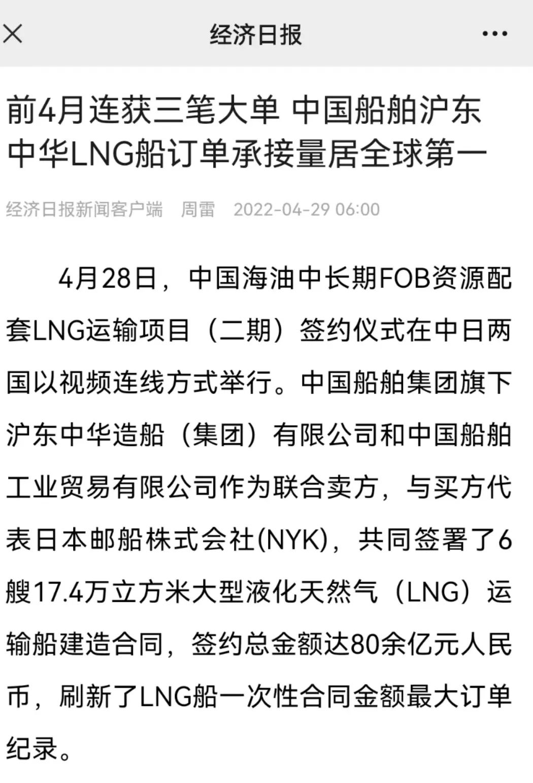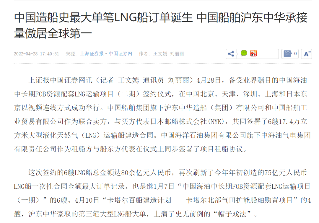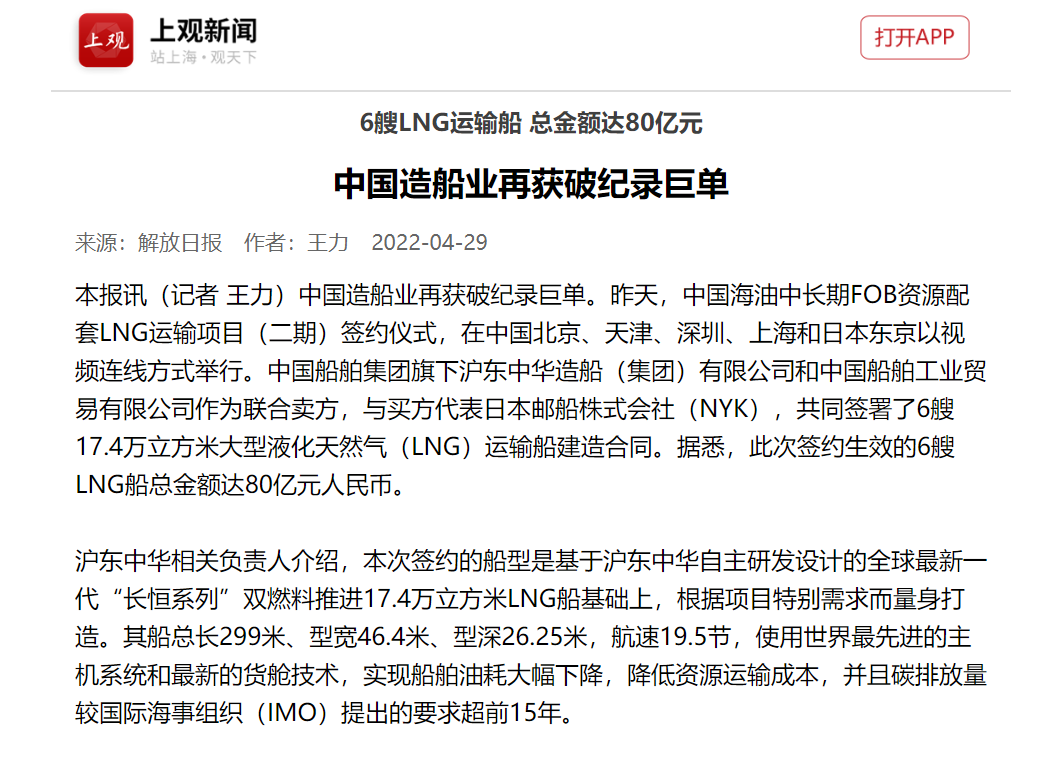 4月28日,中國海油中長期FOB資源配套LNG運(yùn)輸項(xiàng)目(二期)簽約儀式,在中國北京、天津、深圳、上海和日本東京以視頻連線方式成功舉行。中國船舶集團(tuán)有限公司旗下滬東中華和中船貿(mào)易作為聯(lián)合賣方,與買方代表日本郵船株式會社(NYK),共同簽署6艘17.4萬立方米大型液化天然氣(LNG)運(yùn)輸船建造合同。