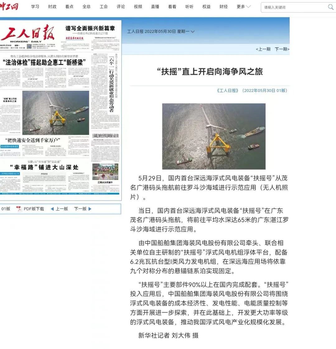 5月29日,中國船舶集團(tuán)旗下中國海裝牽頭研制的國內(nèi)首臺深遠(yuǎn)海浮式風(fēng)電裝備——“扶搖號”從廣東茂名碼頭起航,前往平均水深65米的廣東湛江附近海域投入示范應(yīng)用。
