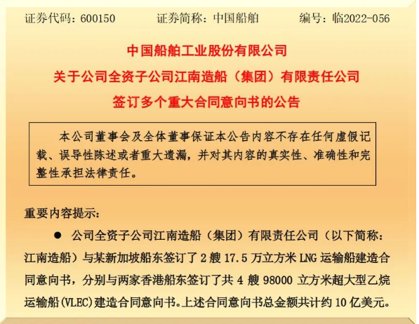 10月25日,中國船舶集團有限公司旗下上市公司中國船舶工業(yè)股份有限公司發(fā)布《關(guān)于公司全資子公司江南造船(集團)有限責(zé)任公司簽訂多個重大合同意向書》的公告。根據(jù)公告,江南造船共與相關(guān)船東簽署了2型6艘約10億美元新船建造合同意向書。