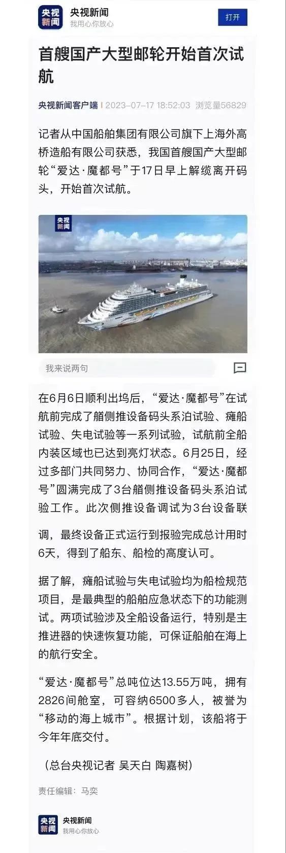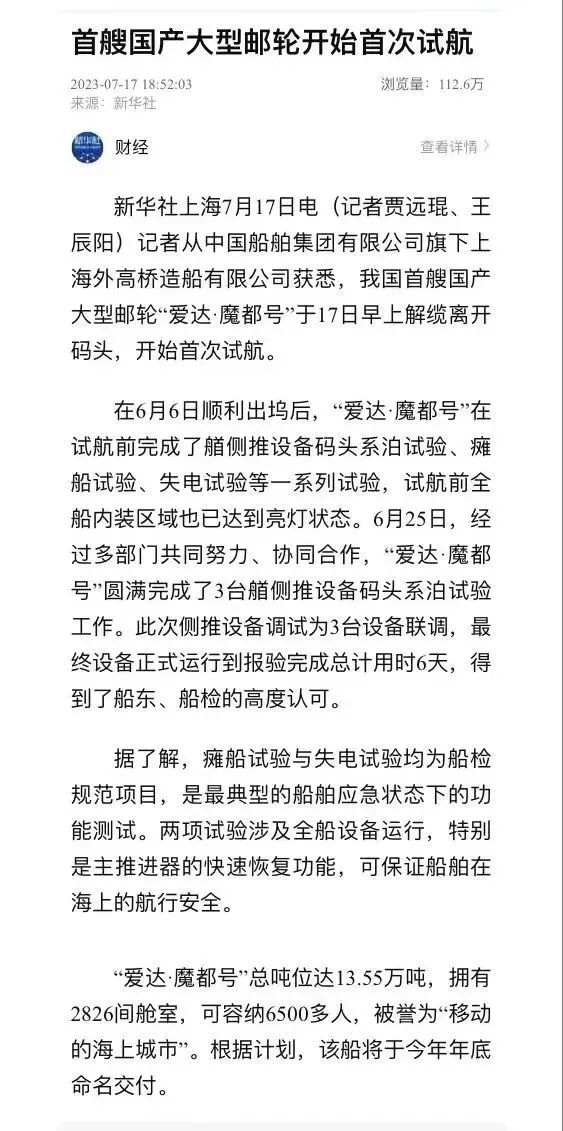國產首制大型郵輪試航