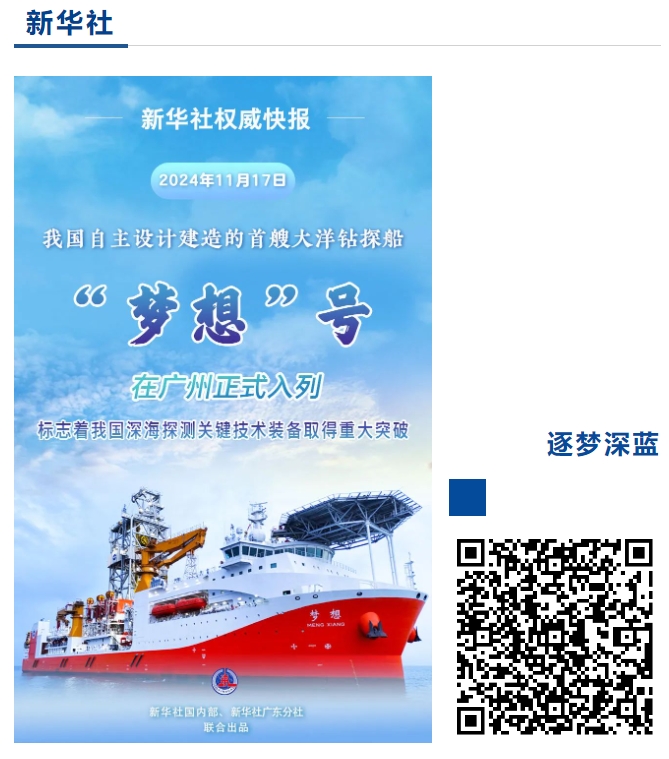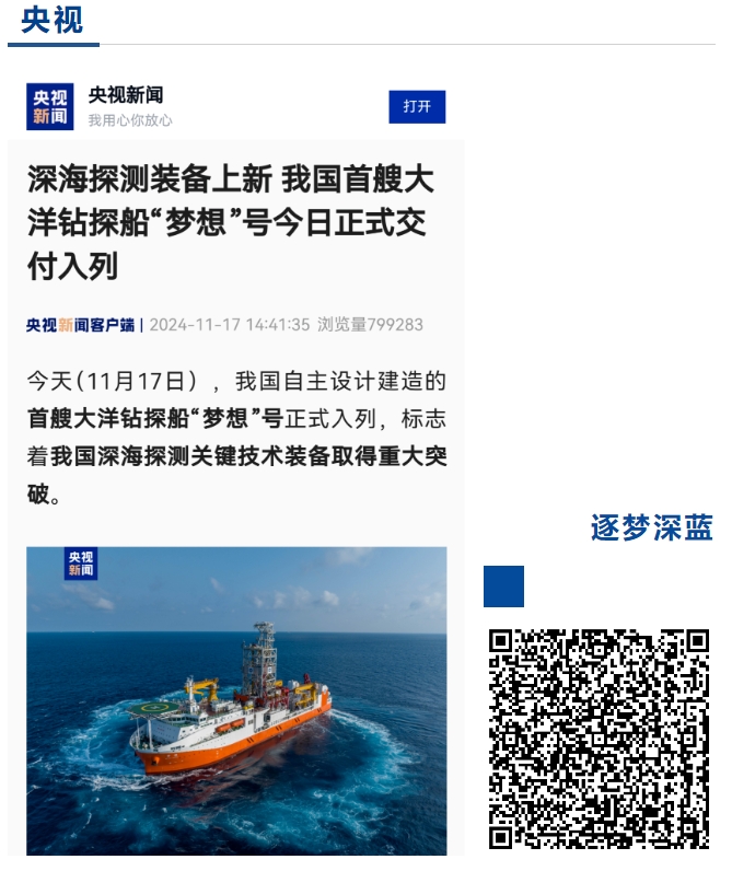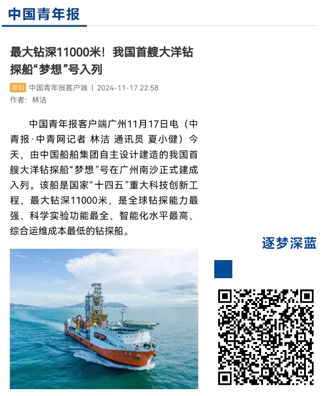 11月17日,中國船舶集團自主設計建造的我國首艘大洋鉆探船“夢想”號在廣州南沙交付入列,人民日報、新華社、央視等媒體的記者來到交付現場進行報道 。